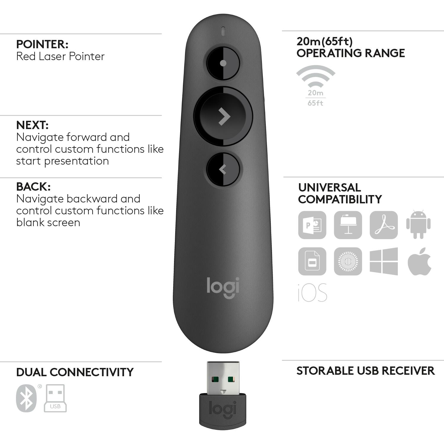 Introducing the R500, a plug-and-play presentation remote that allows you to navigate slides and laser point from up to 20 meters (65 feet) away.1 Deliver your presentation with ease and confidence thanks to the unmistakable three-button design and R500’s comfortable, secure fit in hand. The R500 is optimized for most devices and popular presentation software – and you can customize buttons, check battery life, and set an on-screen timer in the Logitech Presentation App.